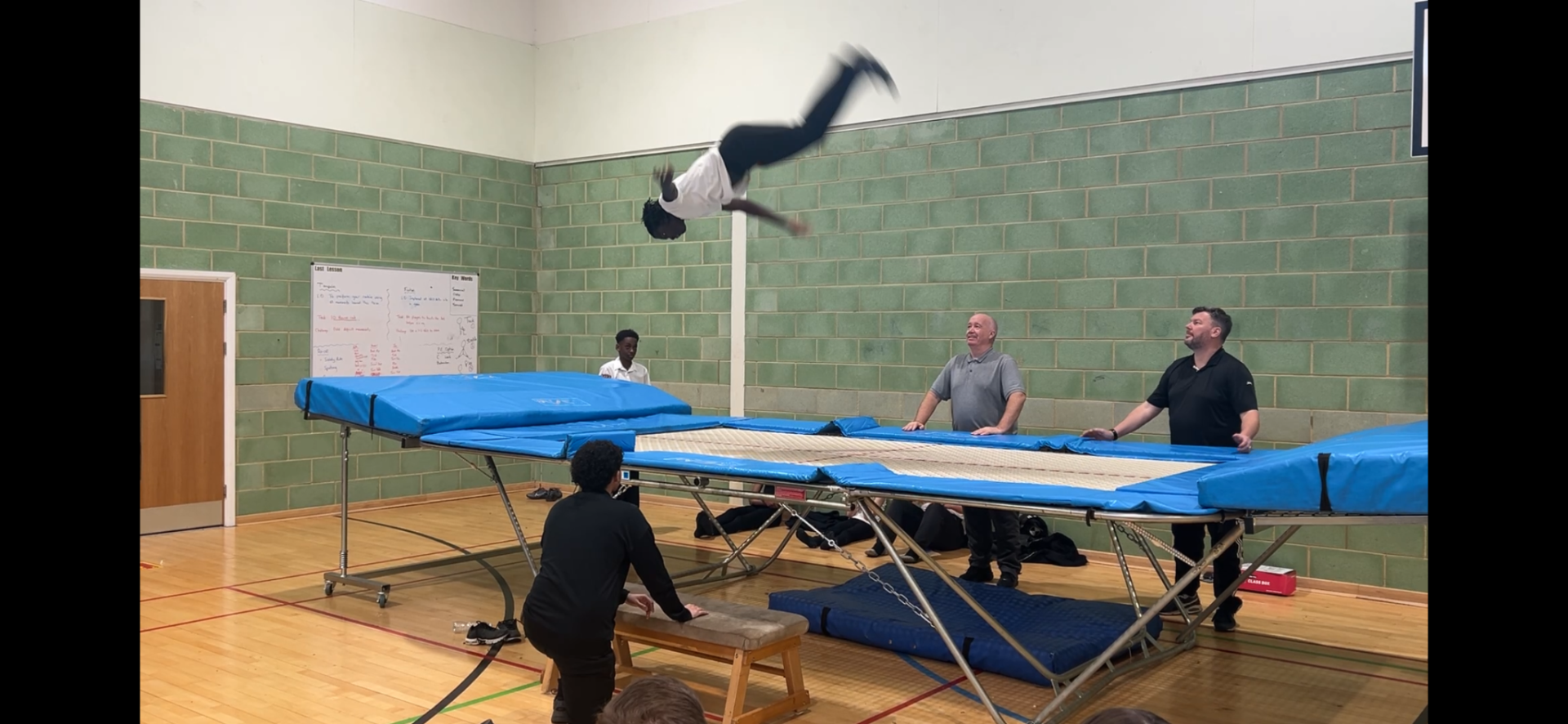 From the very first time the trampoline was introduced in a PE lesson, trampolining became an instant hit with the pupils. They have shown great enthusiasm in trying new moves, refining their skills, linking sequences, and creating their own routines. Trampolining has encouraged the boys to be brave, ambitious, creative, and focused in their approach. It has been particularly rewarding to see pupils supporting and coaching one another. Many showed a genuine desire for their peers to succeed, demonstrating leadership, compassion, and the ability to communicate clearly in order to help others improve. There was a real buzz of excitement in the lead-up to the trampoline display, which was performed in front of an audience of around thirty family members, friends, and teachers. While some performers appeared nervous and others excited, there was an unmistakable sense of pride in the room as the pupils performed and the audience watched. The display was a great success and a real privilege to be part of and witness.